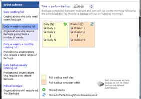 Also unique to BackupAssist is that each rotation scheme is tailored to suit the hardware device being used. For example, BackupAssist has a range of rotation schemes for USB Hard Drives, where Tape-based schemes are not appropriate. Schemes provided include rotating HDDs daily, the option to include separate weekly and monthly backups, or the alternative option of performing a weekly full backup and daily incrementals.