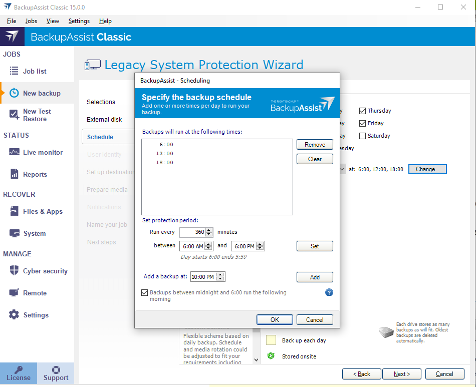 Legacy System Protection backups can be run more than once per day by selecting Multiple times daily from the Back up drop down. Select the Change button to set the schedule and review the reporting requirements.