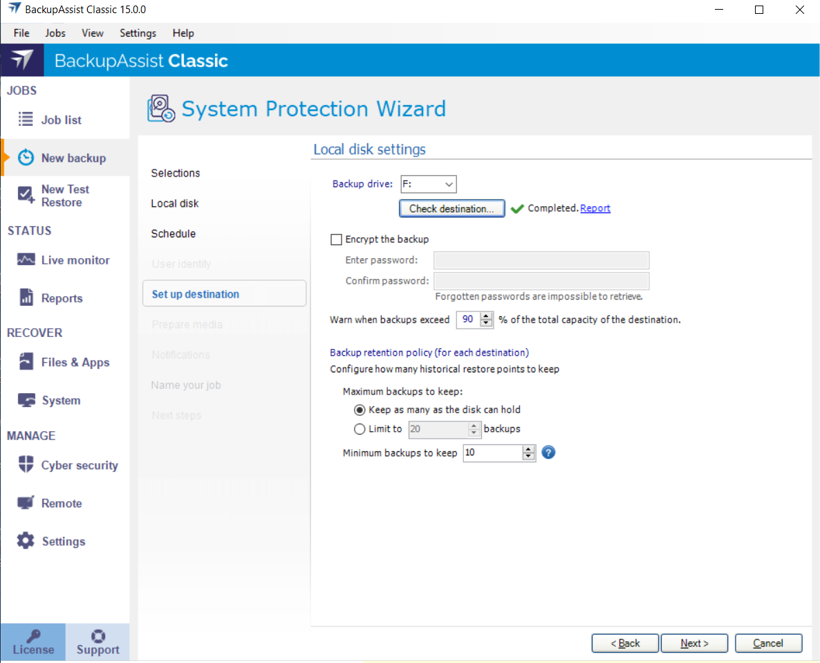 If you are using a Local media or a Local network destination, a Check destinationbutton will be available to check your backup destination for problems. After the checks have been completed, the results can be viewed by selecting the Report link. If you are using Removable media destinations, these checks are performed when you select Prepare on the Prepare Media step.