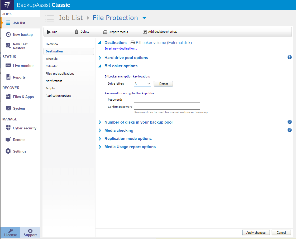 BitLocker is a Microsoft encryption solution that is supported by BackupAssist for System Protection, File Protection and File Archiving backups to removable drive destinations.