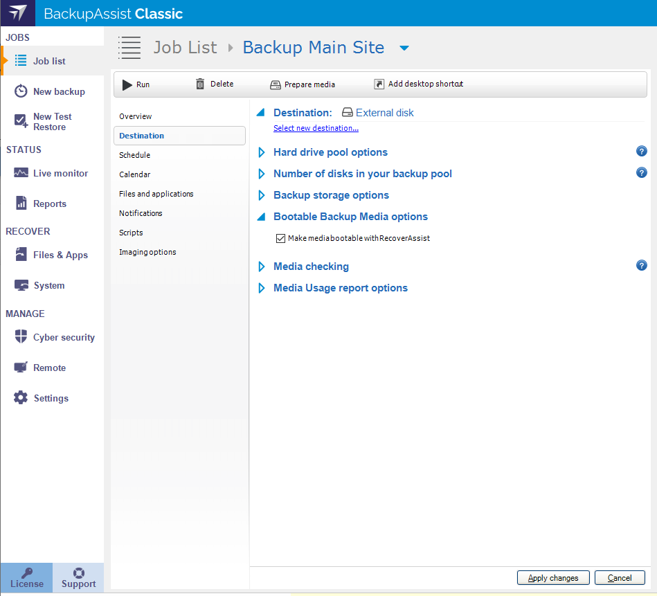The backup media will be made bootable the first time the job runs unless you deselect the Make media bootable with RecoverAssist tick box.