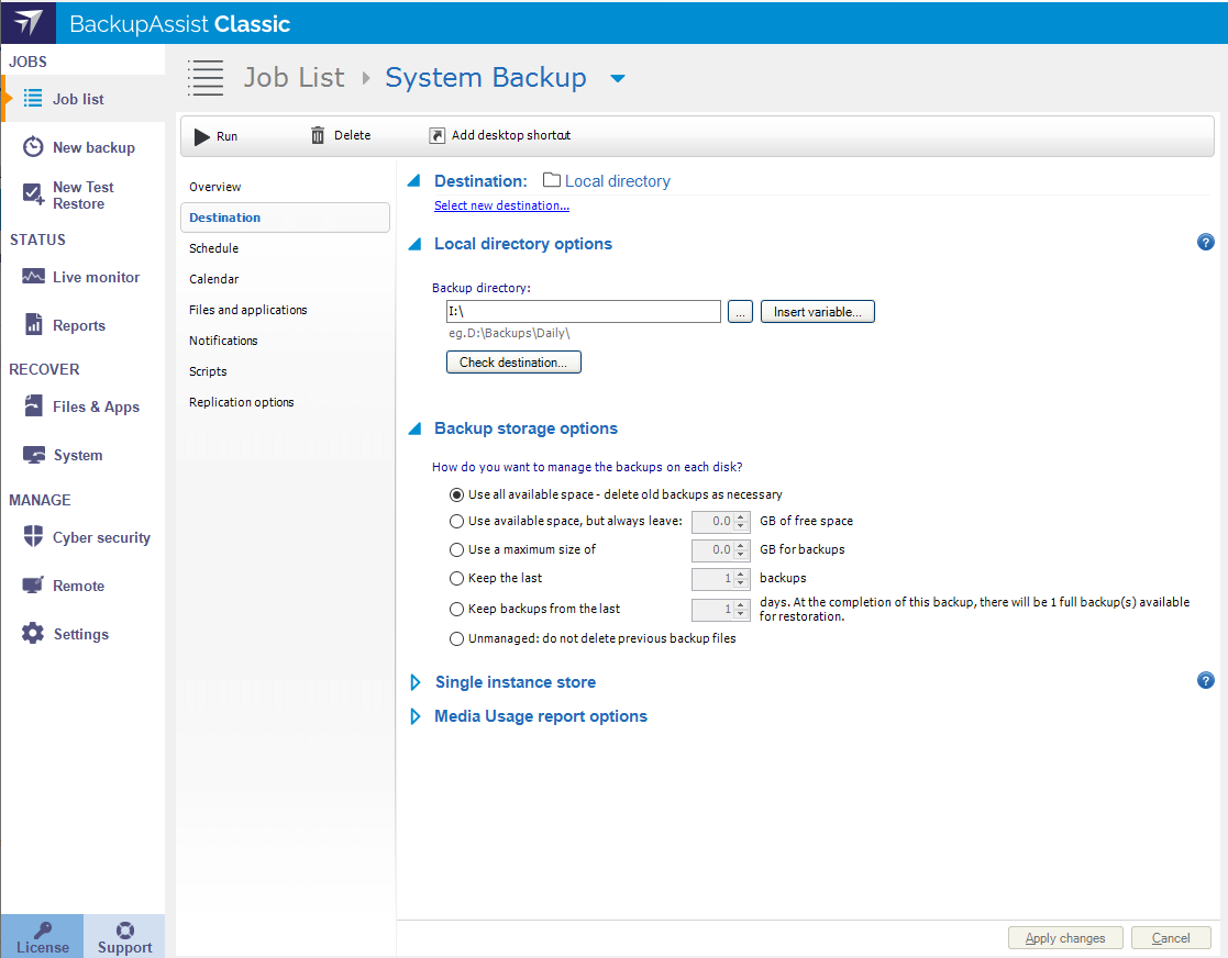 Below is a list of the sections and options available. What you see in BackupAssist will depend on the backup job's current settings.