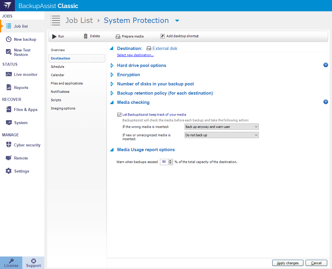 Removable drives are backup destinations that are externally connected to your computer. For example, external USB Hard Drives and RDX drives. This section explains the removable media options available when you edit a System Protection backup job.
