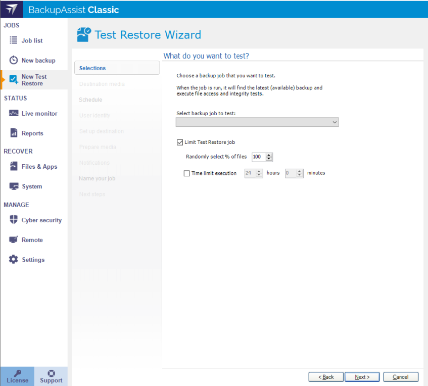 A Test Restore can take as long as a full backup of all files in the backup job. The Limit Test Restore job option gives you control over the test's duration by allowing you to set a percentage-based sample size of files to be tested, and these files will be randomly selected each time the job runs. You can also set the Time limit execution, which will stop the test once that time limit is reached.