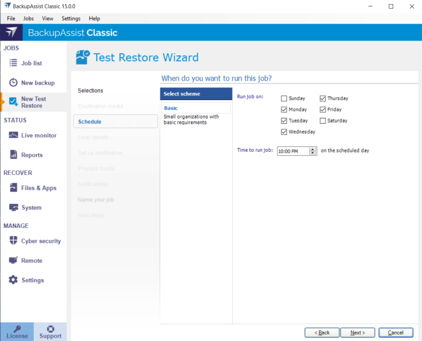 A Basic backup scheme is provided by default. It will run the job on selected day and time. For example, select Saturday (or Sunday) if you only want to test the backups once a week.