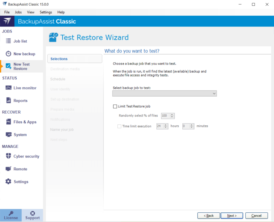 - Select backup job to test using the drop-down list of supported backup jobs.