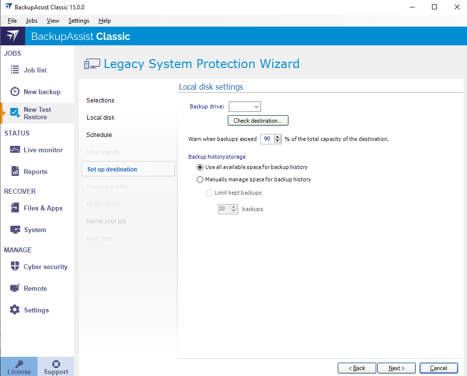 If you are using a Local media or a Local network destination, a Check destinationbutton will be available to check your backup destination for problems. After the checks have been completed, the results can be viewed by selecting the Report link. If you are using Removable media destinations, these checks are performed when you select Prepare on the Prepare Media step.