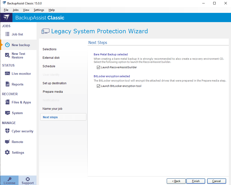 If this box is ticked, the BitLocker Encryption tool will open when you select Finish. When the tool opens, you can use it to encrypt the drives. This should be done before the backup job runs, because if an unencrypted drive is used for a BitLocker backup job, the job will fail. The BitLocker encryption tool can run in the background after BackupAssist has been closed.