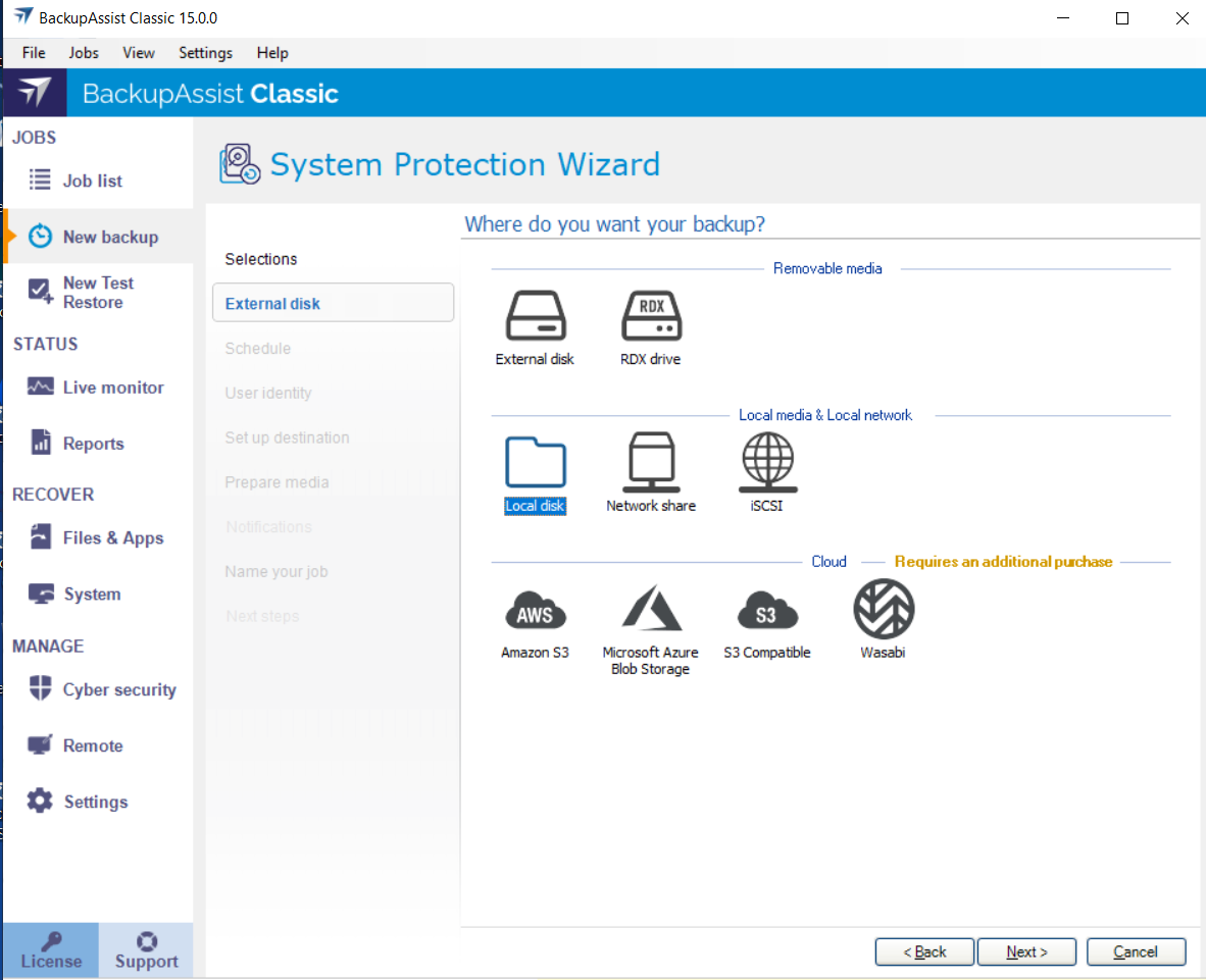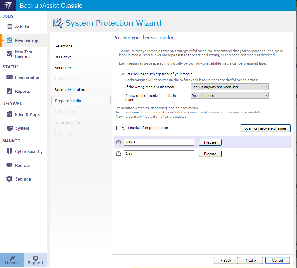 This step will allow you to prepare removable media (External disk destination selection) and label it. If you are not using external drives, we recommend Editing the backup job once you have created it and using the Prepare Media option to label each drive. - Let BackupAssist keep track of your media. Deselect this if you do not want to prepare and label your media.