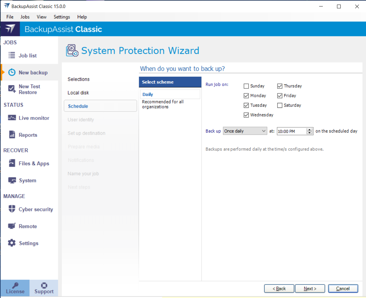 This step is used to select when (days and times of the week) and how you want the backup job to run. A selection of pre-configured schedules, called schemes can be selected. Select the desired backup scheme and review the options available. - Set up destination.