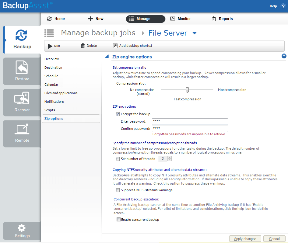 The Zip Options section allows you to modify the settings of File Archiving backup jobs. This includes enabling concurrent backups, changing the level of compression and enabling ZIP encryption.