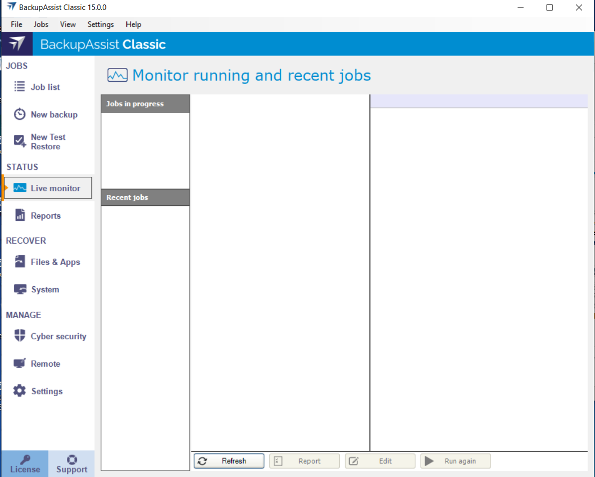 The Monitor screen has three panes. The left pane's Job in progress section shows what backup job is currently running. The Recent jobs sections lists the backup jobs that have run. The middle pane shows the sequence of steps that have been performed by the backup job that is running, or last ran. The right pane shows the statistics for the backup job that is running, or last ran.