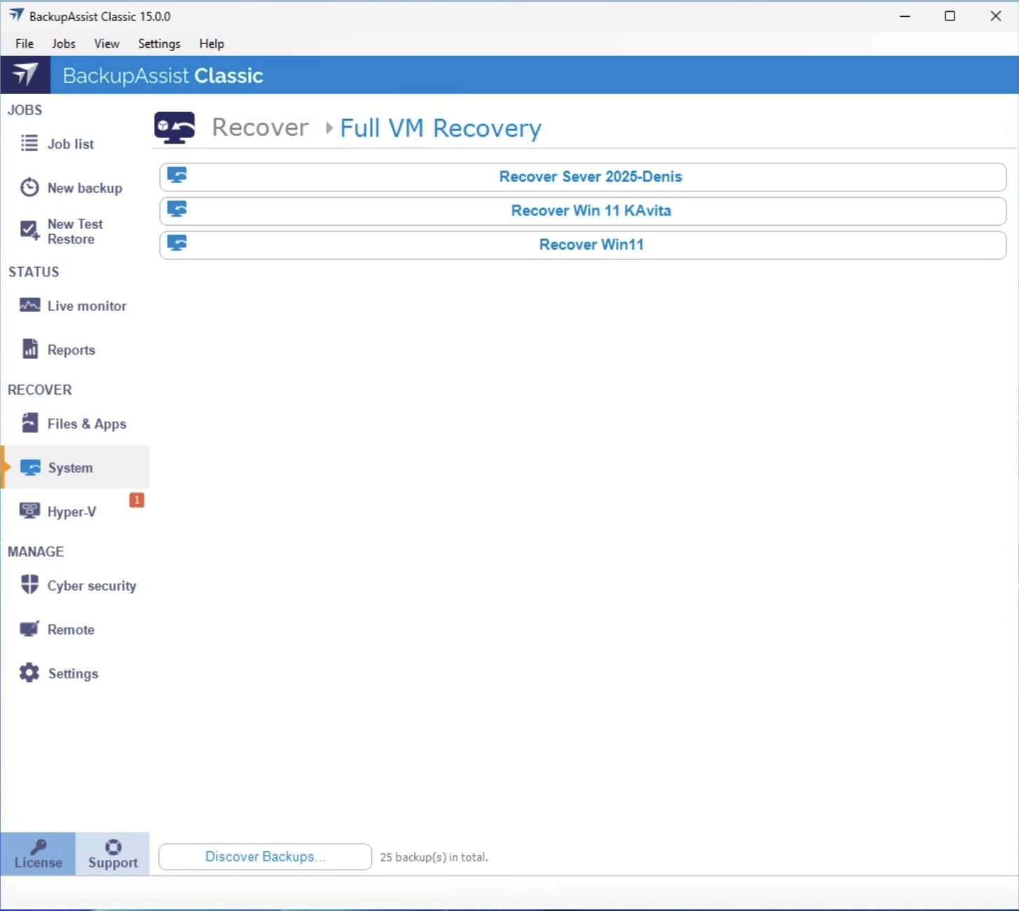 3. When you select Full VM Recovery, the Full VM Recovery screen will open and display all of the guests that have been backed up by this installation of BackupAssist.