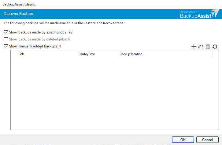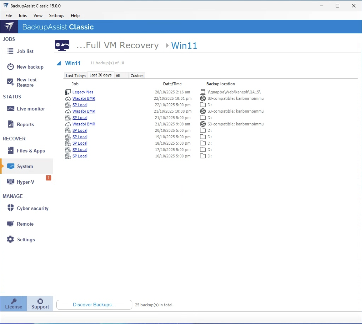 7. Select the backup that you want to use for the recovery. The tabs can be used to filter the backups shown. Selecting a backup will open BackupAssist'sIntegrated Restore Console.