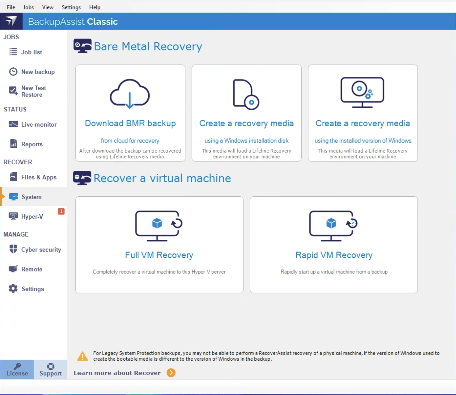 When a hardware or operating system failure occurs, and a server can no longer start itself, a bootable recovery media can start the system, load a recovery environment and use a System and Volume bare-metal backup to recover the server. BackupAssist uses RecoverAssist to create a bootable media.