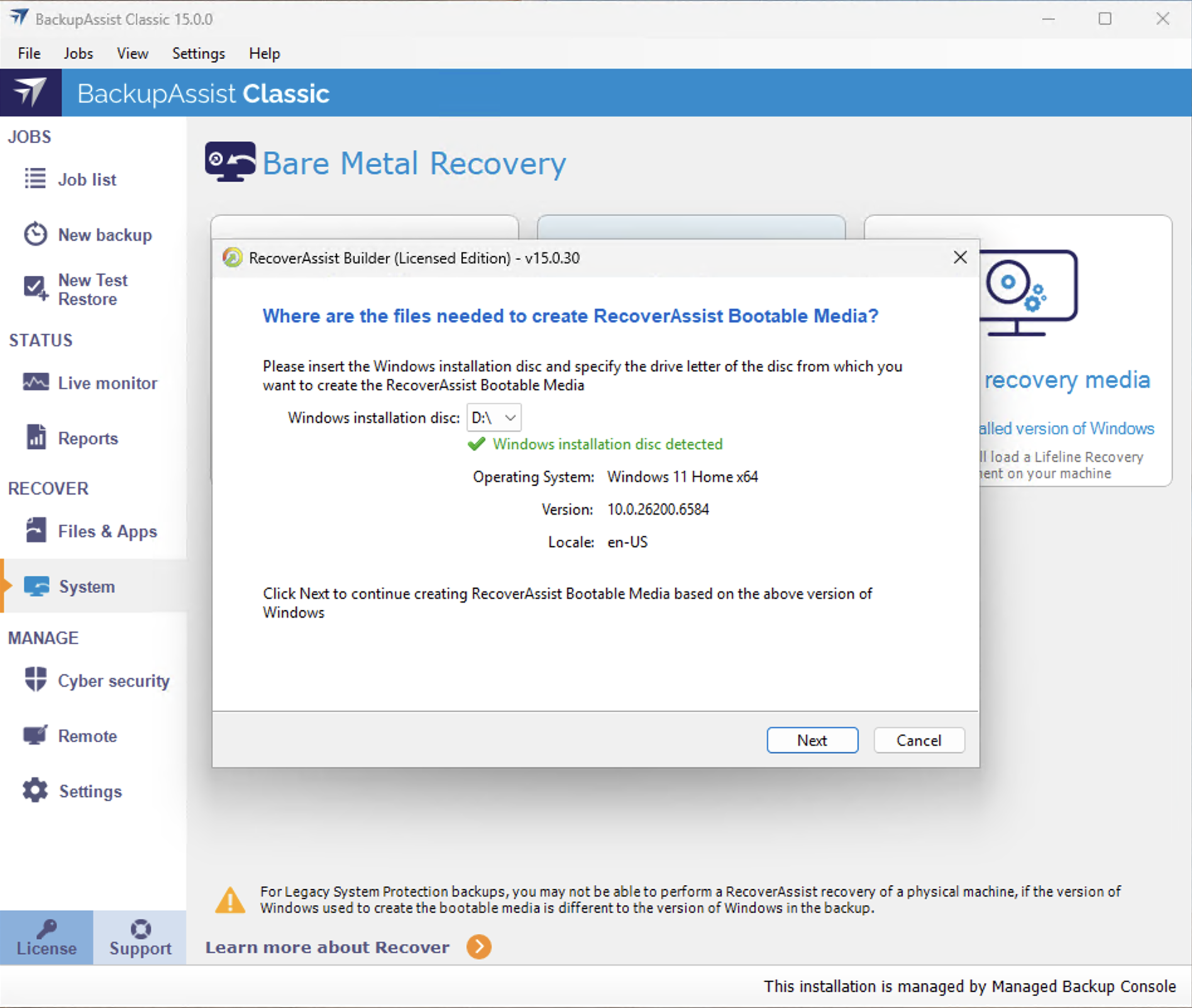 Warning: OEM installations of Windows and Windows installation media provided by system manufacturers may include altered system files that could cause RecoverAssist recovery environments to fail. BackupAssist recommend the use of a Microsoft issued install disk or ISO when building RecoverAssist recovery media.