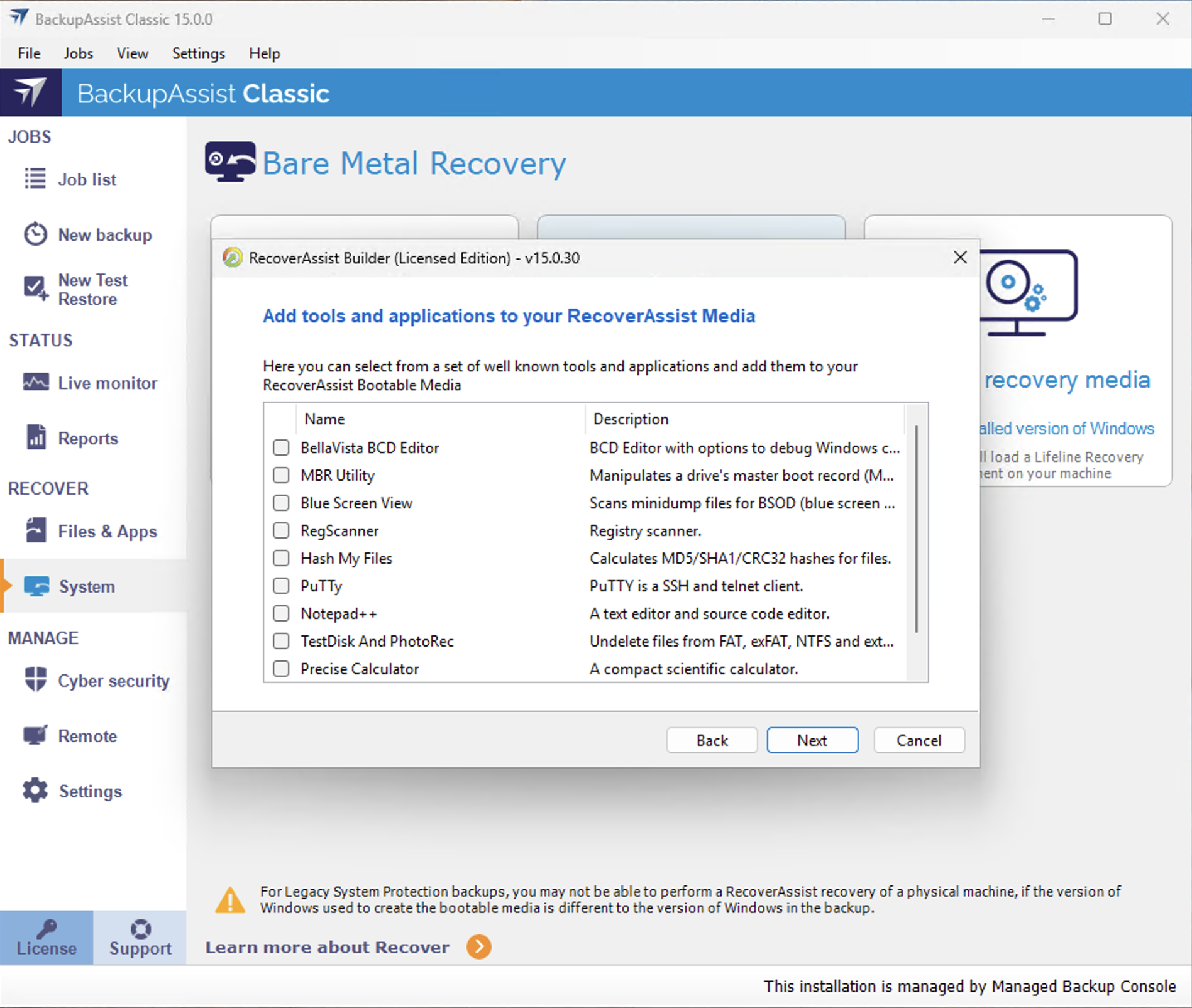 Warning: Any bootable RecoverAssist media created during the BackupAssist trial period it will expire. The RecoverAssist media will need to be re-created once a BackupAssist license has been purchased. This must be done after you purchase a license.