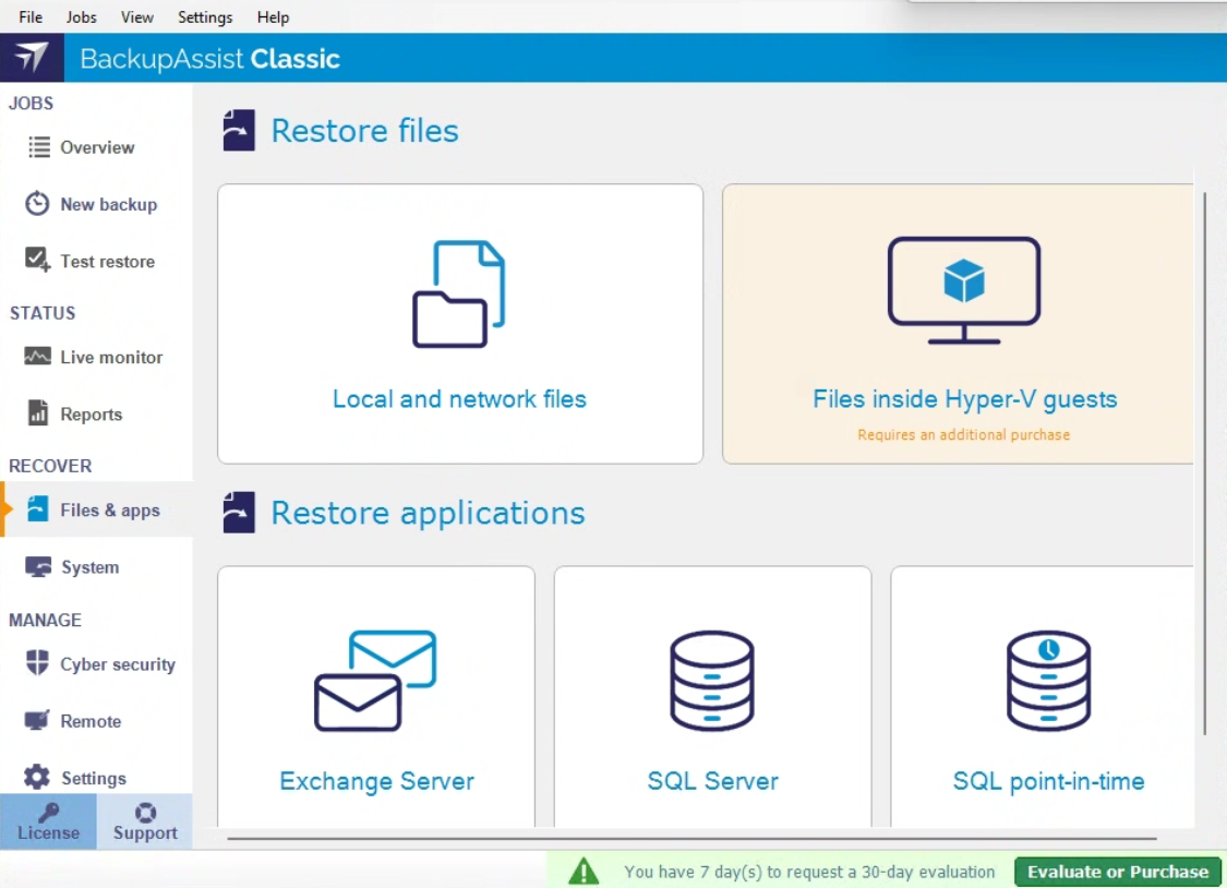 The main tab provides many restore options grouped under Restore files and Restore applications. The latter is for restoring Exchange and SQL servers. In some cases, you would need to have the relevant add-on to execute specialized restore operations like Files inside Hyper-V Guest and SQL Point-in-Time restore.