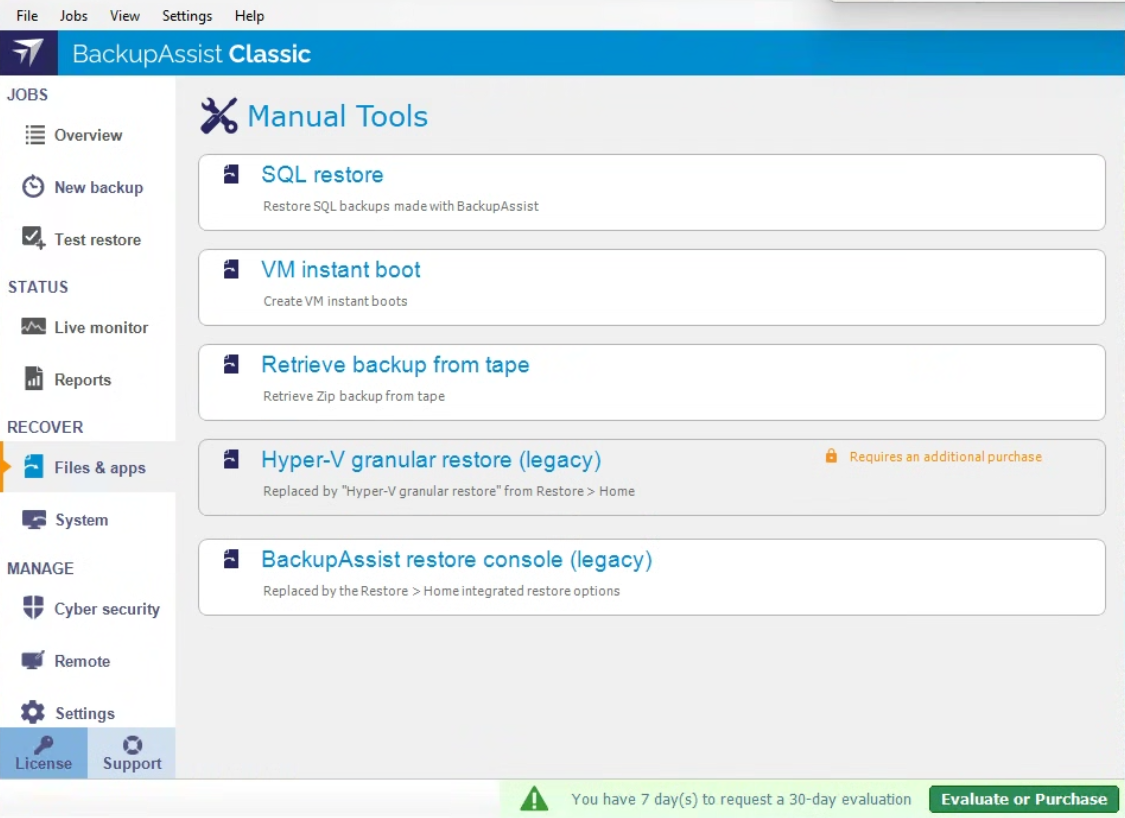 The Manual Tools option shows the different restore tools available in BackupAssist. You can access specialized recovery tools such as VM Instant boot and restoring a zip backup from tape. These restore tools should only be used by experienced users and BackupAssist technical support.