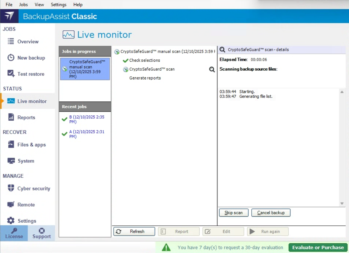 The first time you run a job with CryptoSafeGuard enabled, it will scan files modified in the last 3 months. This scan may take some time depending on the amount of data being backed up. Subsequent scans will be incremental and a lot faster, with minimal impact on the jobs’ run times. When you start using CryptoSafeGuard there will be a per-job grace period, and if a job detects possible ransomware, a warning will be displayed but the backup jobs will not be blocked. The grace period for a job lasts until the job has 3 consecutive clean scans. Grace period warnings will display a yellow banner in the BackupAssist UI.